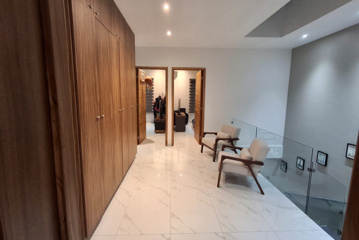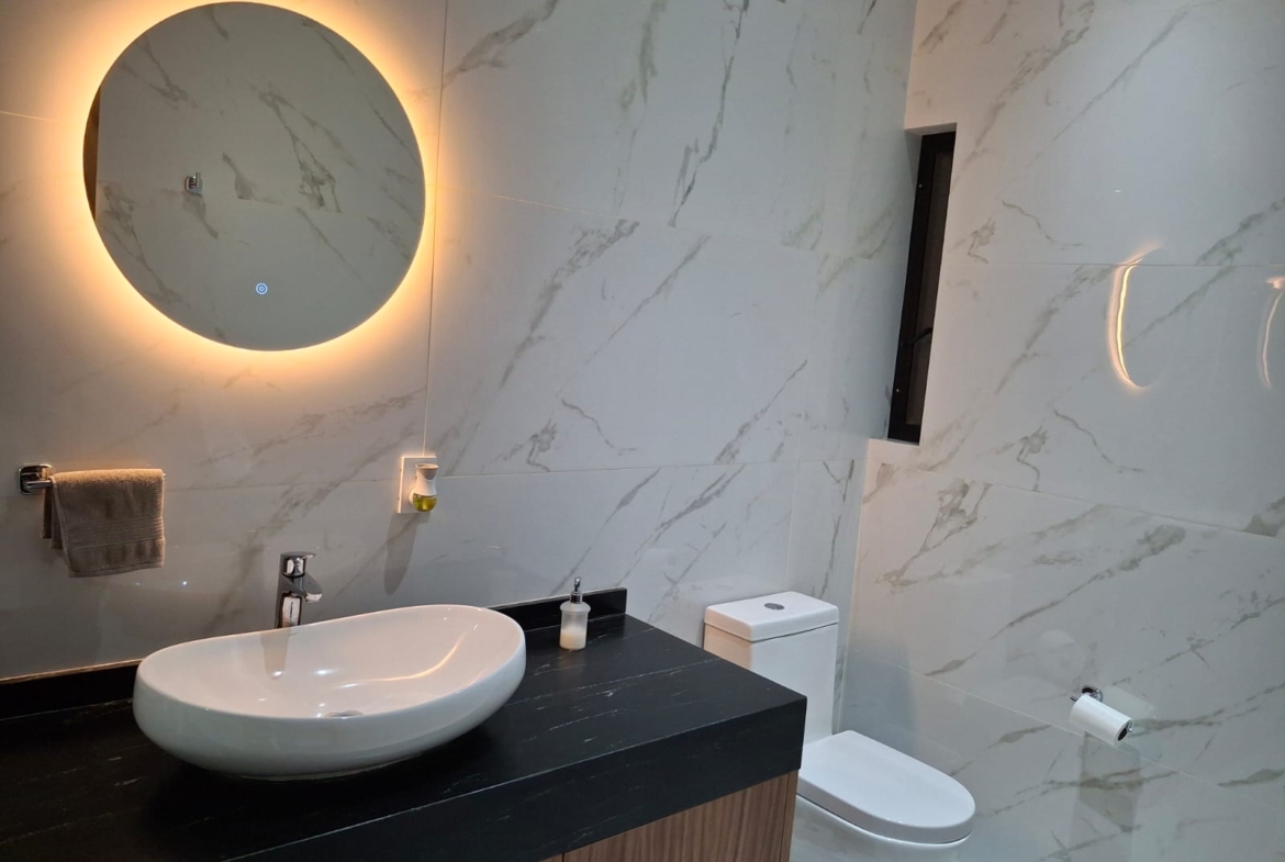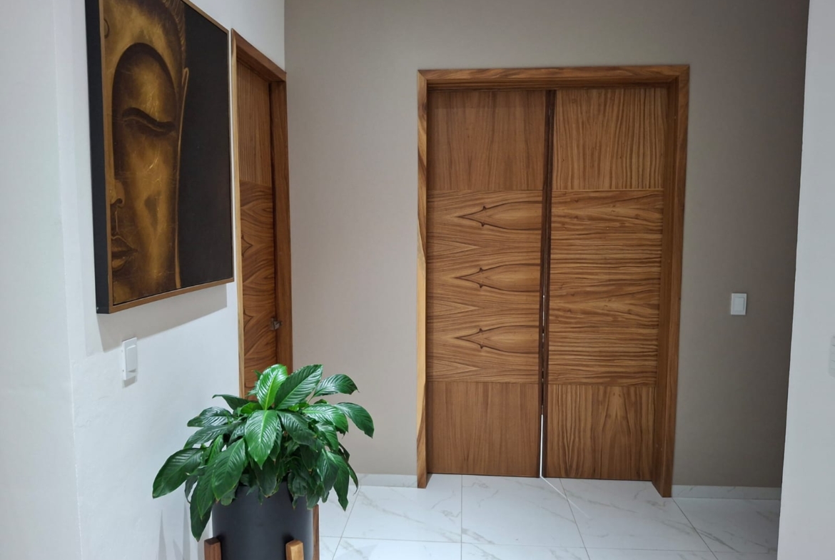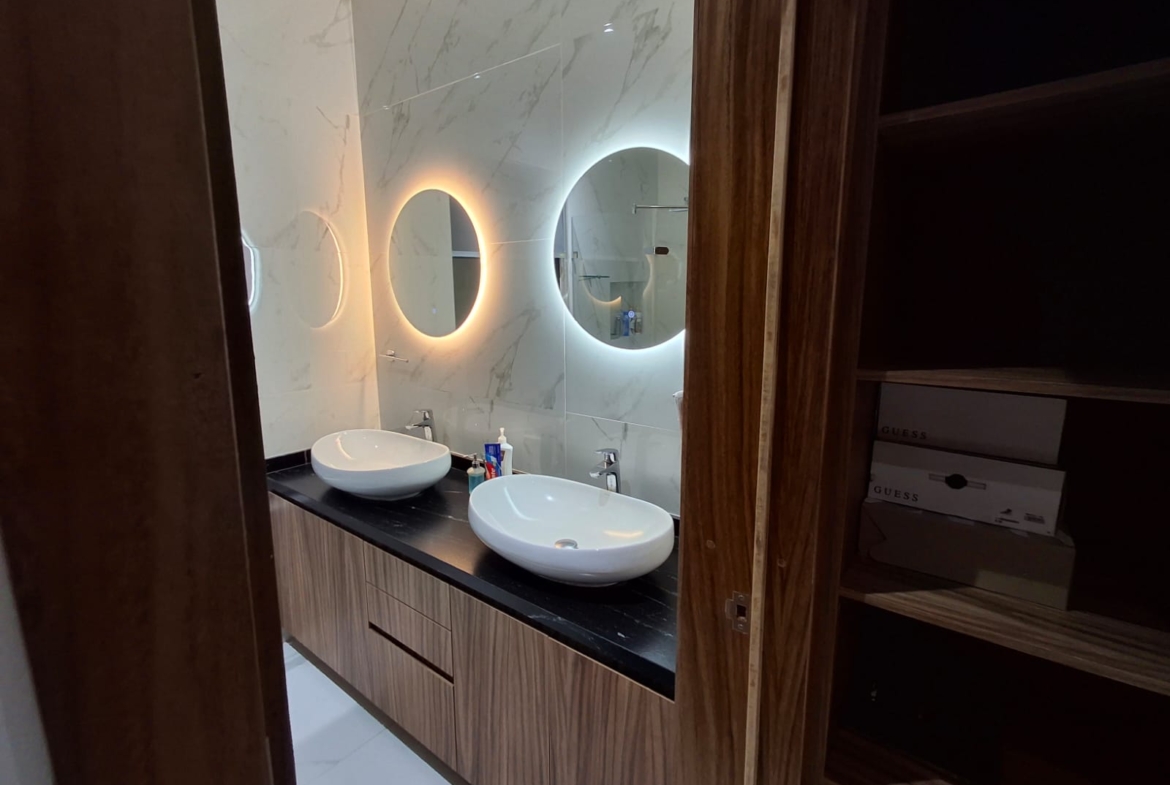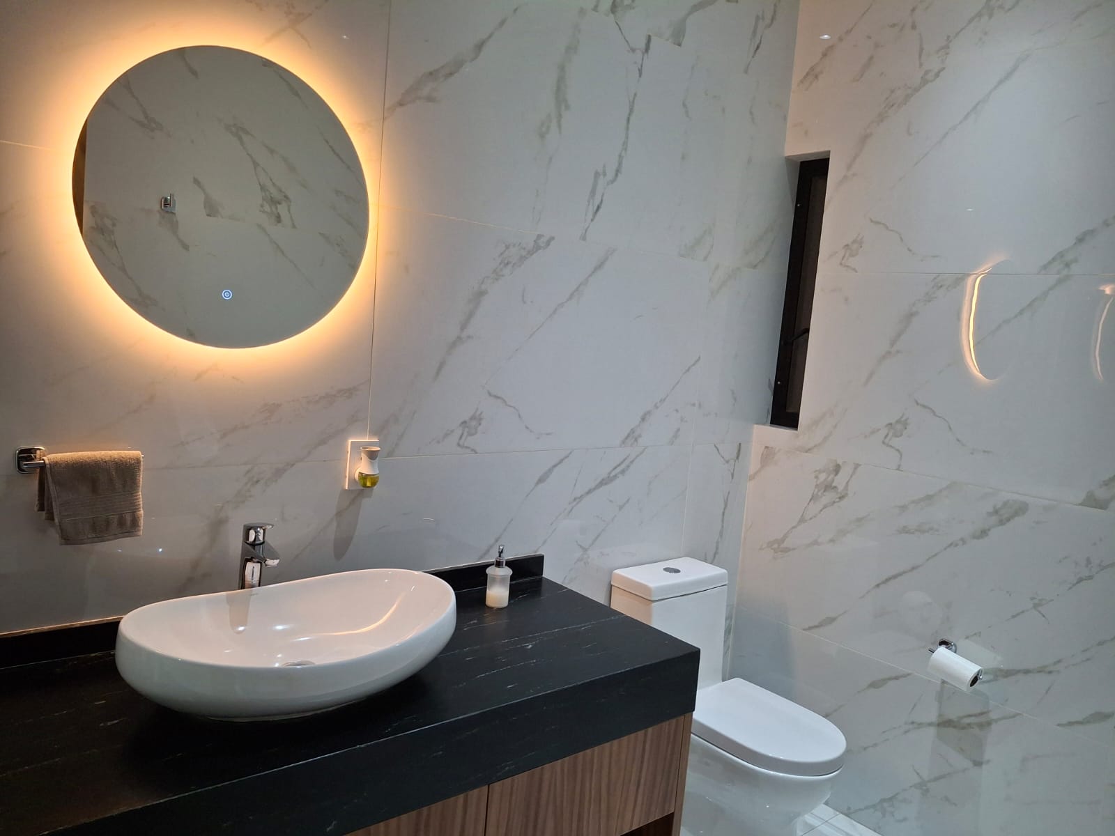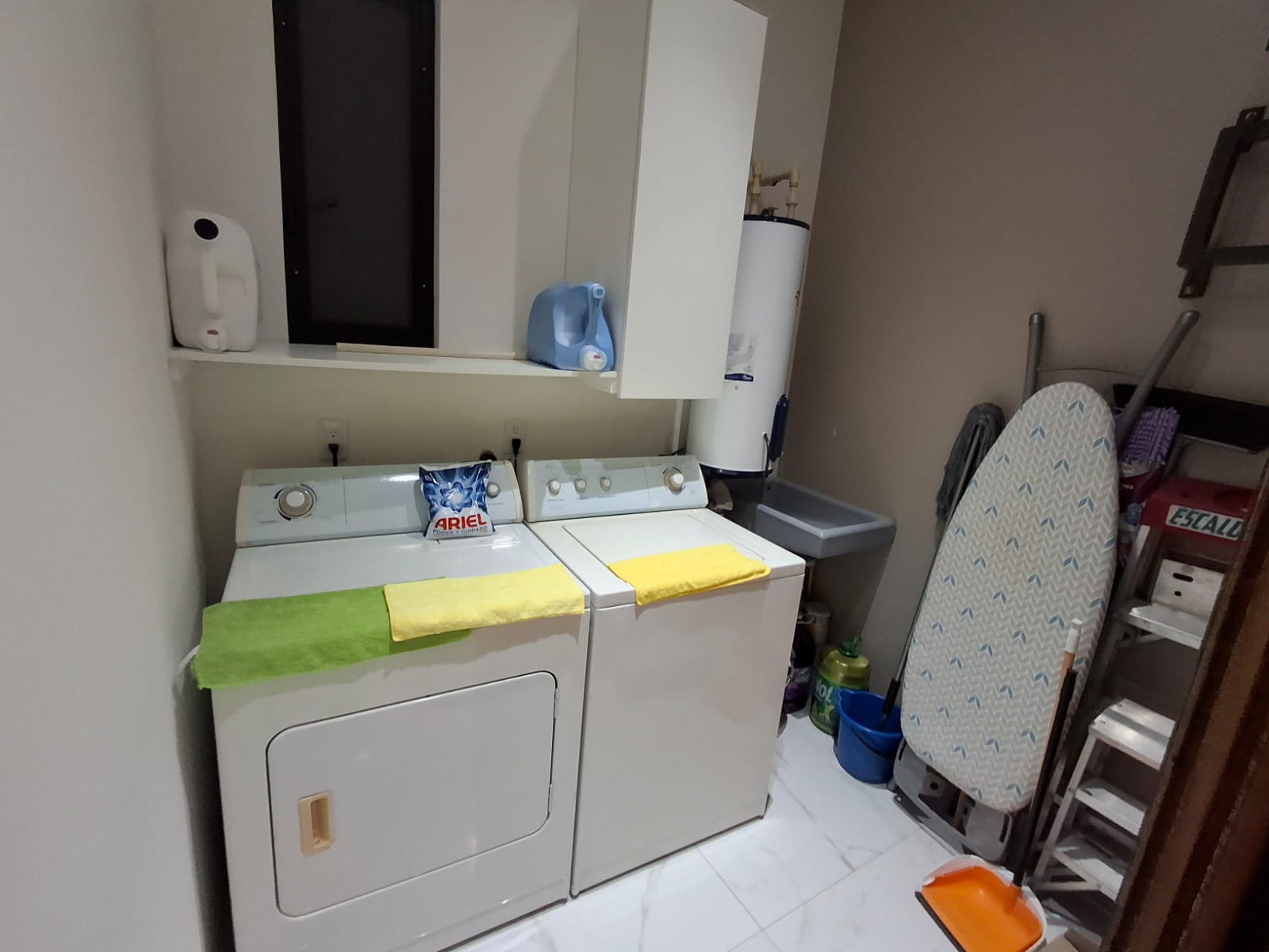 En planta alta 3 recamaras, la principal muy amplia con closet vestidor y baño completo con doble ovalin, cuarto de lavado, closet de blancos y 2 recamaras secundarias (una de ellas cuenta con A/A) comparten baño completo.