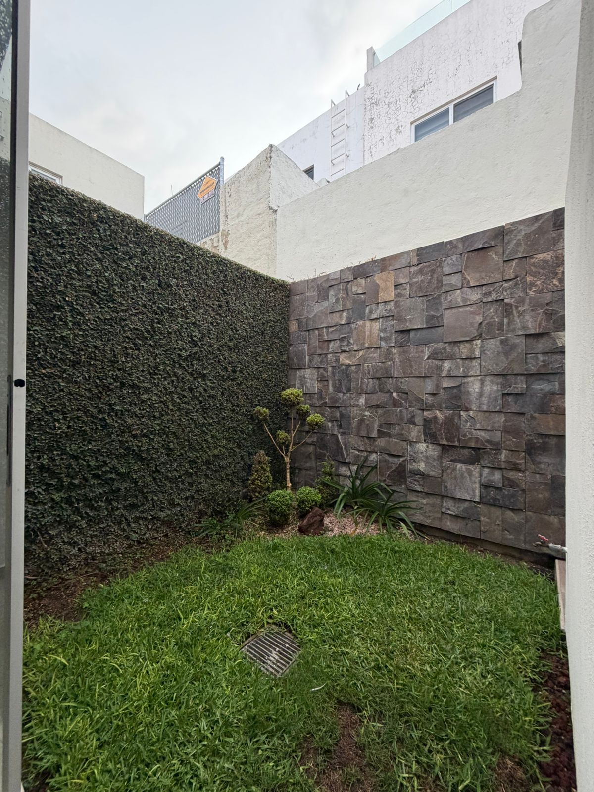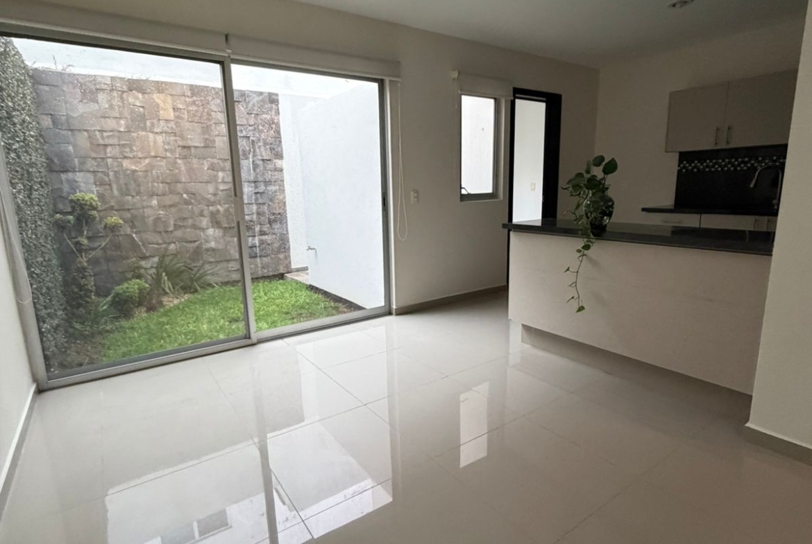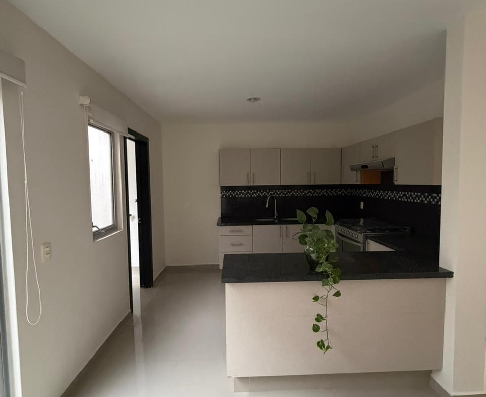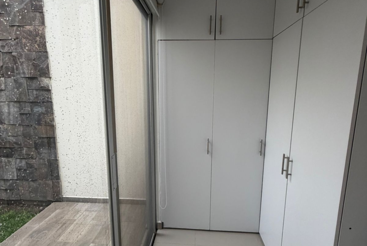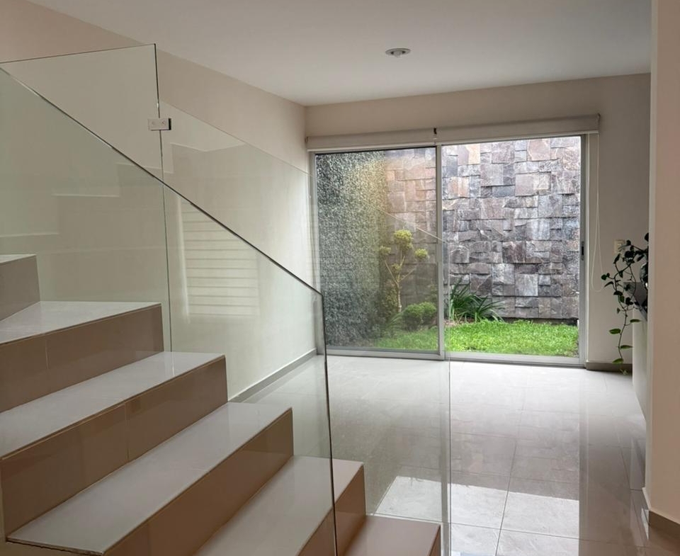 Cocina con barra cubierta de granito, recámara principal con baño y vestidor, la secundaría con closet y baño, la tercera con closet, todas cuentan con aire acondicionado amplio distribuidor con closet en planta alta, baños con cubierta de mármol, cristal en puertas, escalera con barandal de cristal, jardín interior, cuarto de lavado, vigilancia, áreas comunes, terraza, pequeña alberca.
