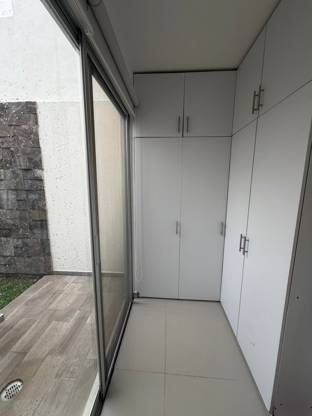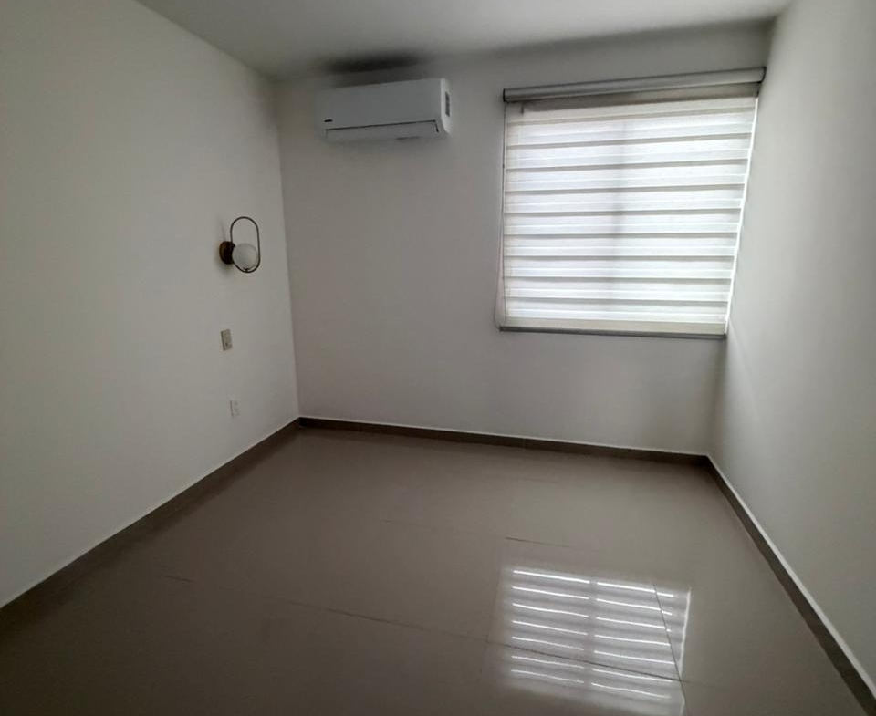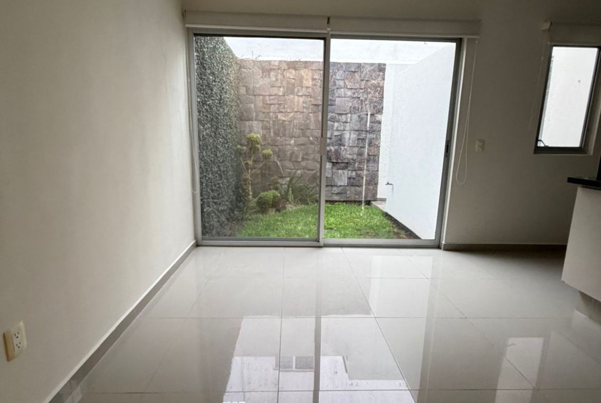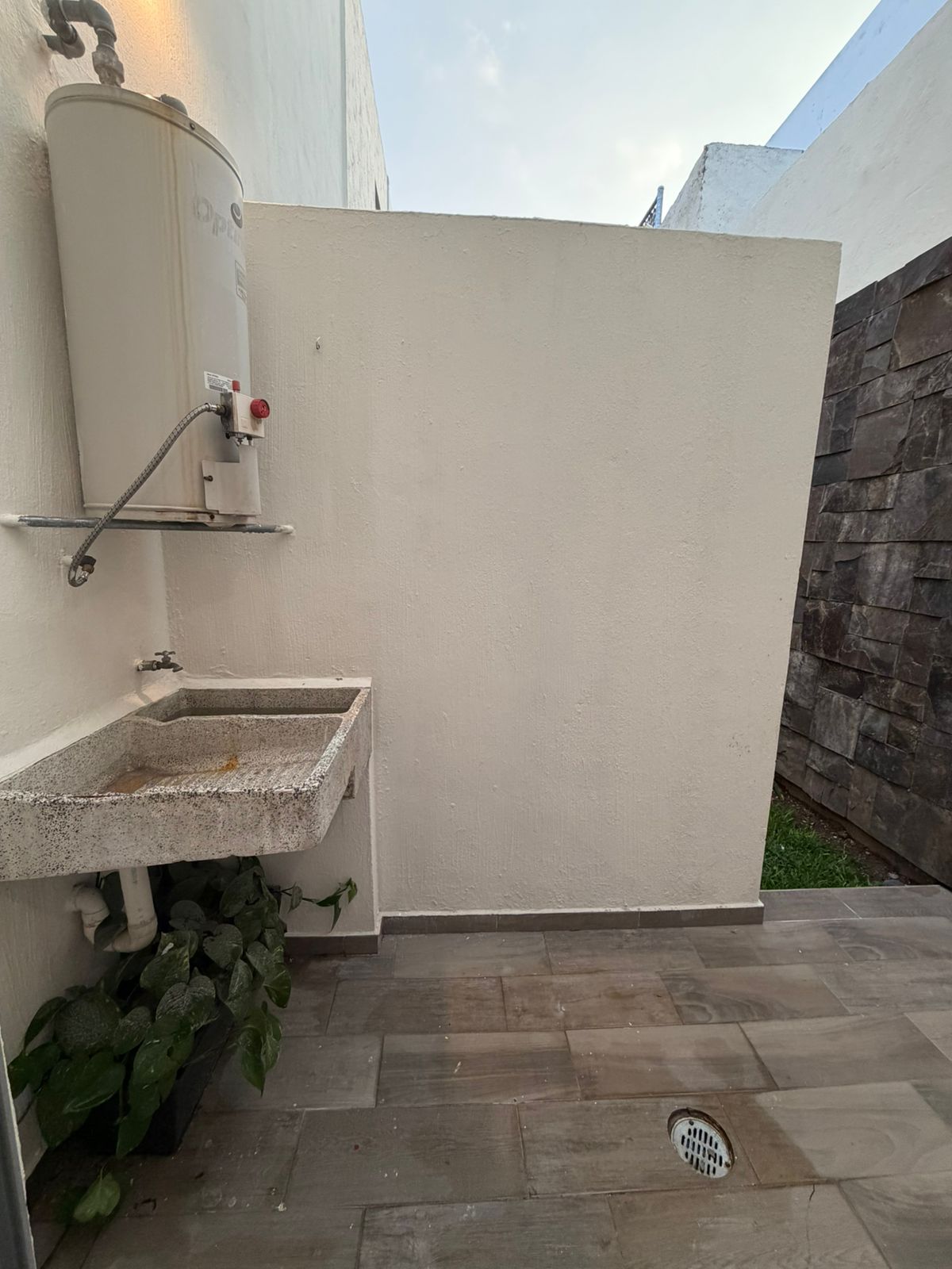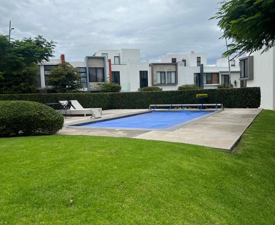 Cocina con barra cubierta de granito, recámara principal con baño y vestidor, la secundaría con closet y baño, la tercera con closet, todas cuentan con aire acondicionado amplio distribuidor con closet en planta alta, baños con cubierta de mármol, cristal en puertas, escalera con barandal de cristal, jardín interior, cuarto de lavado, vigilancia, áreas comunes, terraza, pequeña alberca.