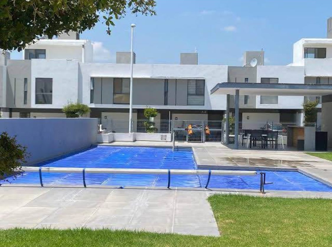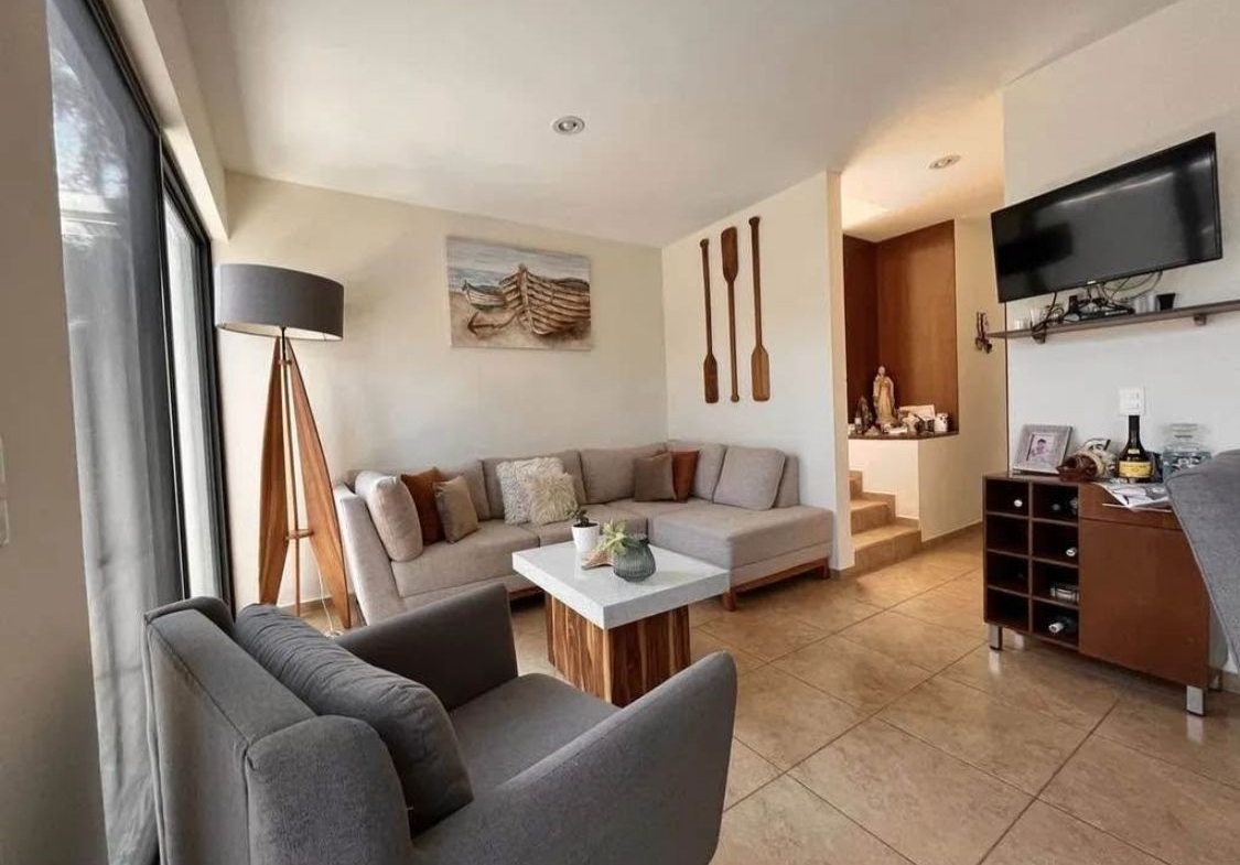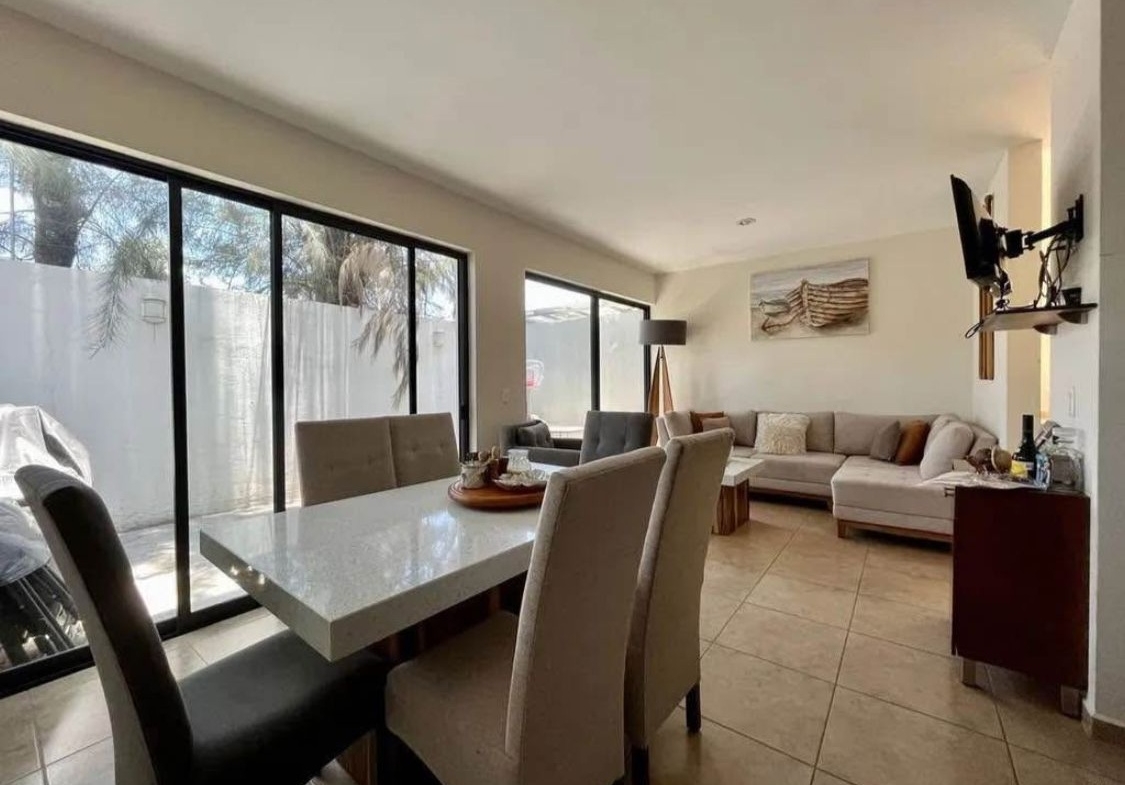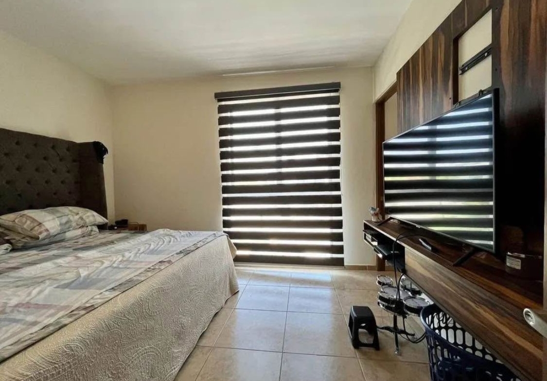 Cuenta con tres recámaras la principal con A/A y amplio vestidor, dos recamaras secundarias que comparten baños completo, jardín, cocina con barra desayunadora, amplia sala comedor.