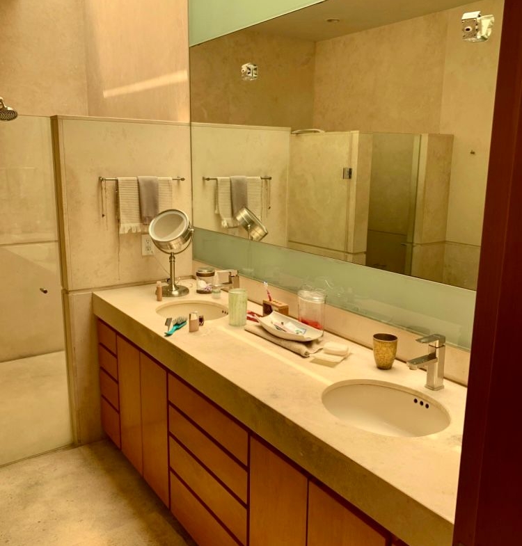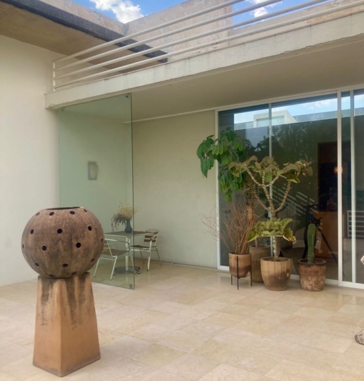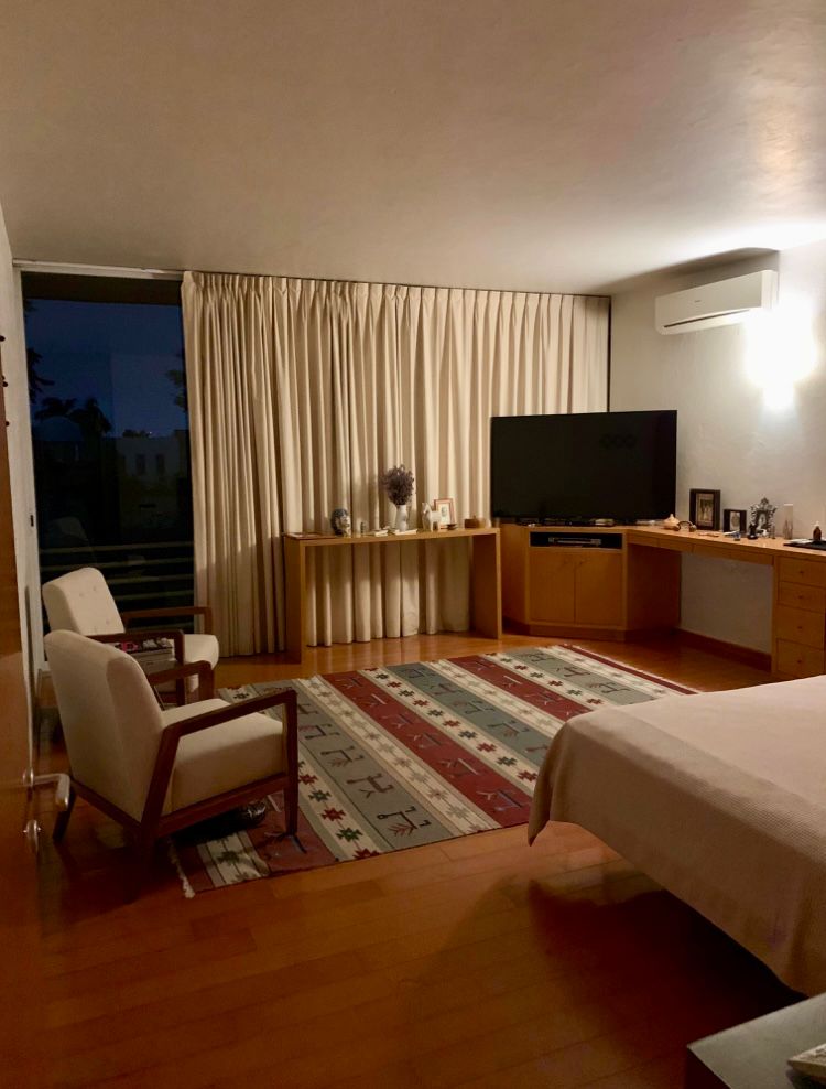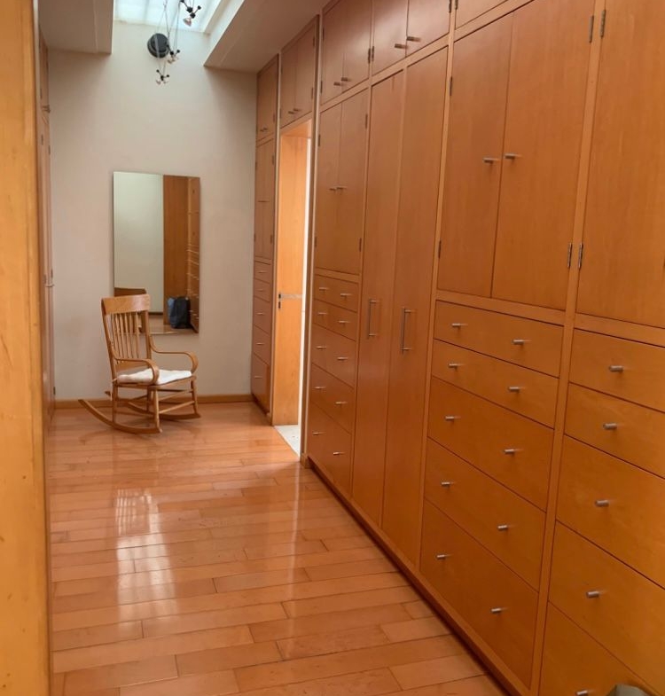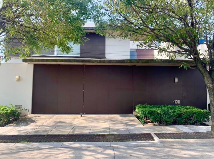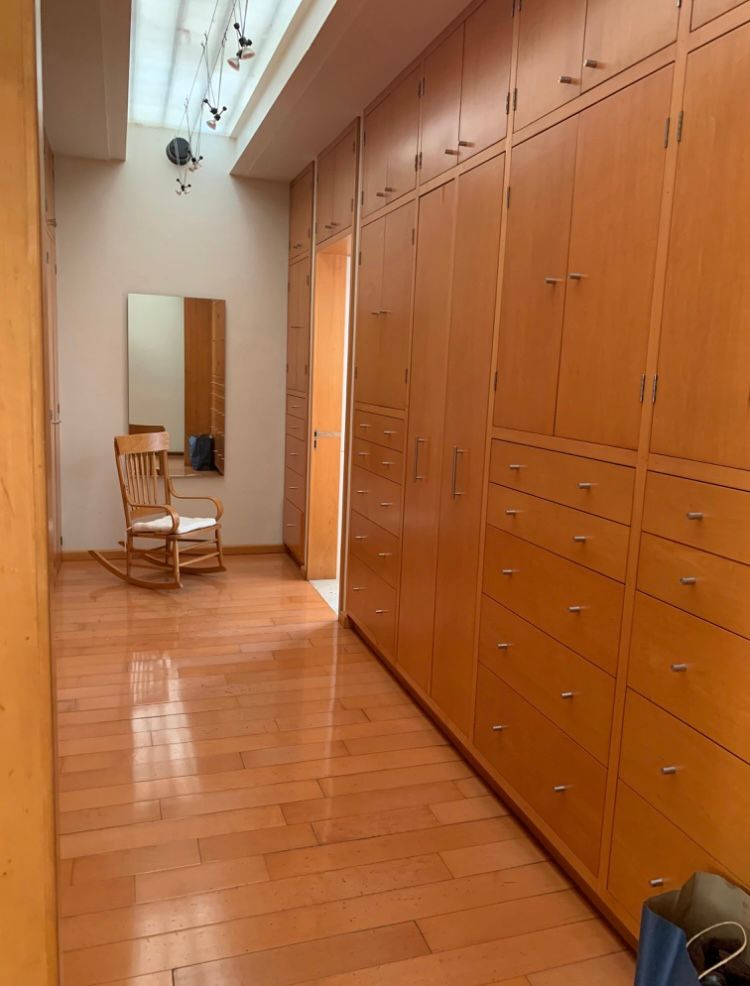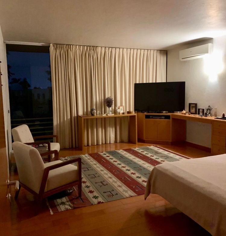 Cuenta con cuatro recámaras con vestidor cada una, tres baños completos, un medio baño, sala, comedor, estudio, cocina integral, equipada con refrigerador, lavavajillas, horno y estufa, cochera para cuatro autos, bodega, portón eléctrico, cuatro a/a y cuarto de servicio con baño completo.