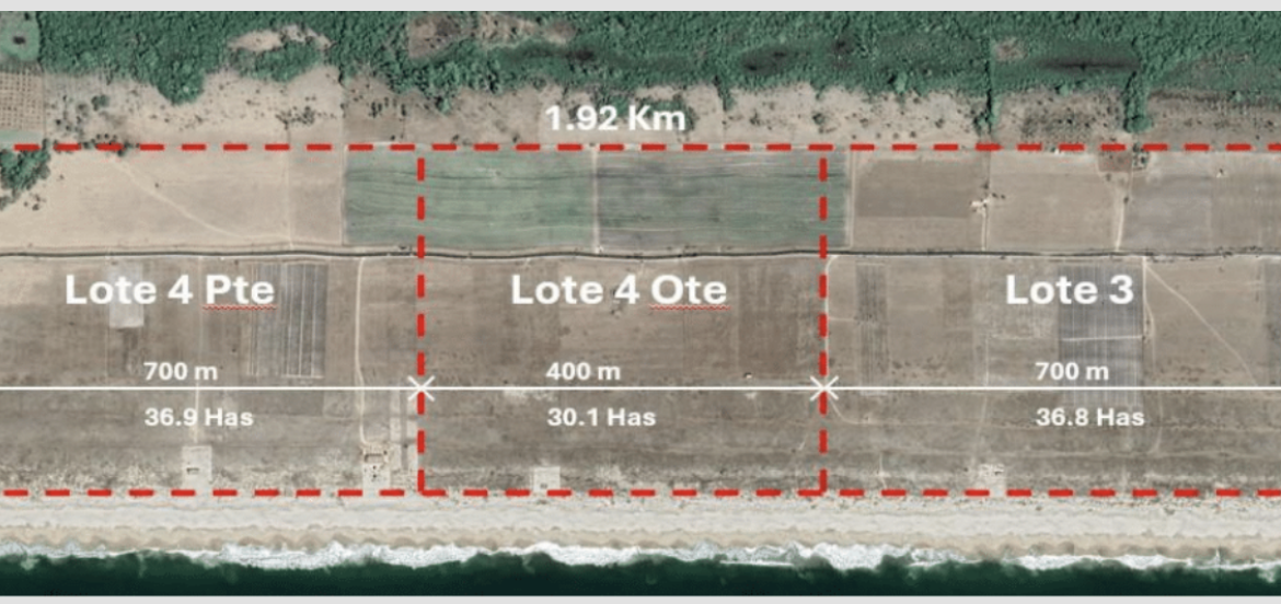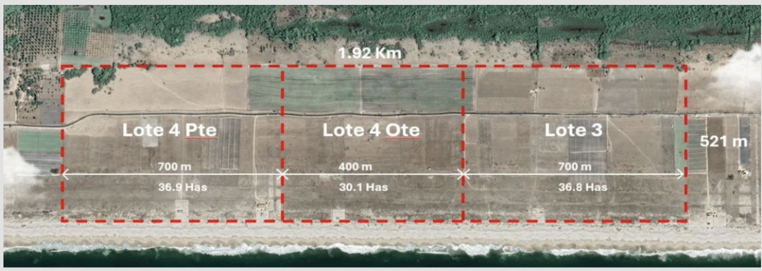 Las 100 hectáreas se componen de 3 macro lotes, juntos de 103 hectáreas, y una extensión de 1.92 kilómetros de